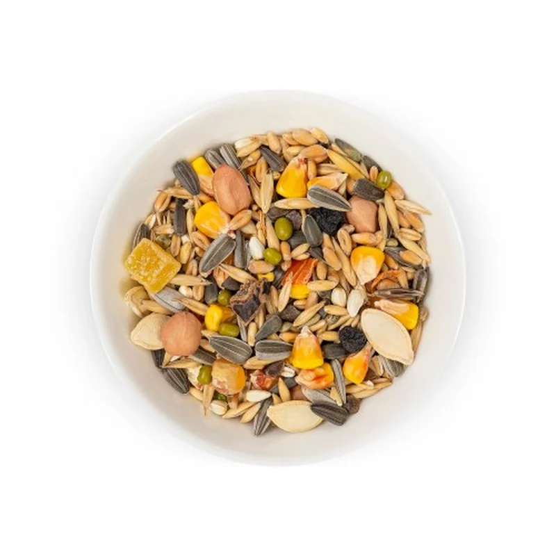 Сушені яблука, горобина, виноград і кероб наближають склад корму до природного раціону птахів, дарують енергію та нормалізують травлення. Завдяки герметичній упаковці корм зберігає приємний аромат і захищений від шкідливої дії вологи