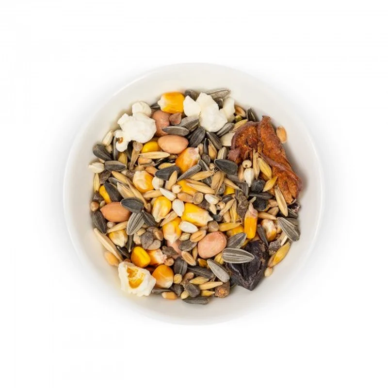 Корм містить необхідні компоненти для нормального розвитку молодих та відмінного стану дорослих птахів. Горіхи, сушені фрукти, кероб та попкорн – улюблені ласощі птахів, які збагачують раціон вітамінами, вуглеводами, білками.