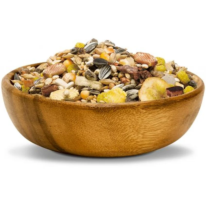 Склад: Злаки (кукурудза 11.5%), Насіння, Фрукти (фініки сушені 4%, банан сушений 1.7%, кокос сушений 1%), Мінерали (шлунковий гравій 3%), Овочі, Олії та жири, Рослинні екстракти білка, Дріжджі (бета-глюкани 90 мг/кг).