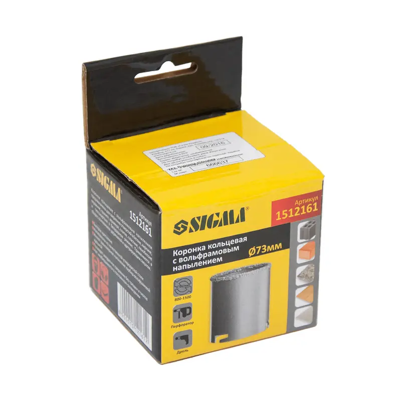 Коронка кільцева з вольфрамовим напиленням 73мм SIGMA (1512161) призначена для свердління отворів в бетоні, цеглі, кераміці, граніті, мармурі, плитці, пластику, пінобетон і гіпсокартон в безударном режимі. Застосовується в зборі з основою-державкою і центруючим свердлом.