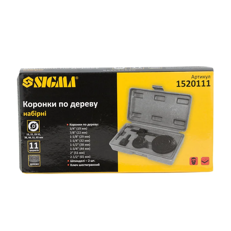 Коронки по дереву набірні Ø19, 22, 29, 32, 38, 44, 51, 65 мм (кейс) SIGMA (1520111)