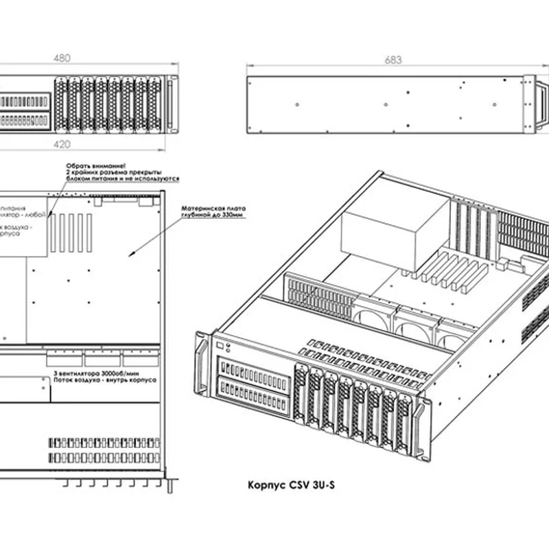 Корпус CSV 3U-S призначений для збирання серверів початкового і середнього рівня з одним або двома процесорами. Можлива збірка двопроцесорних систем. Основна особливість - можливість складання двопроцесорних систем в форматі 3U з установкою стандартного блоку живлення. Для правильного монтажу потрібні телескопічні направляючі або комплект жорсткого кріплення. Установка корпусу на монтажні напрямні тільки за передні кронштейни категорично недопустима. Для монтажу потрібно 8 комплектів кріплення гвинт + гайка + шайба (в комплект не входить і замовляється окремо). Увага! При установці стандартного блоку живлення - він перекриває 2 крайніх роз’єму плат розширення. Тому при проектуванні сервера враховуйте це обмеження. Ключові особливості: Укомплектований 8 кошиками для легкого встановлення жорстких дисків формату 3,5 ". Дозволяє зняти жорсткий диск без розбирання сервера; Можлива установка кошика для встановлення жорстких дисків з гарячою заміною формату 2х5,25 ". Це може бути кошик на 3 диска 3,5" або на 8 дисків 2,5 "; Можливість складання двопроцесорних систем в форматі 3U з установкою стандартного блоку живлення; У комплект входить метиз для збірки сервера.; Сумісний з підлоговими шафами CSV глибиною 800мм. і більше і відкритими стійками CSV глибиною 750мм.; Можлива установка в відкриті стійки CSV глибиною 400мм. Однак в цьому випадку корпус і телескопічні направляючі виступатимуть ззаду на 300мм. тому така установка не рекомендується.