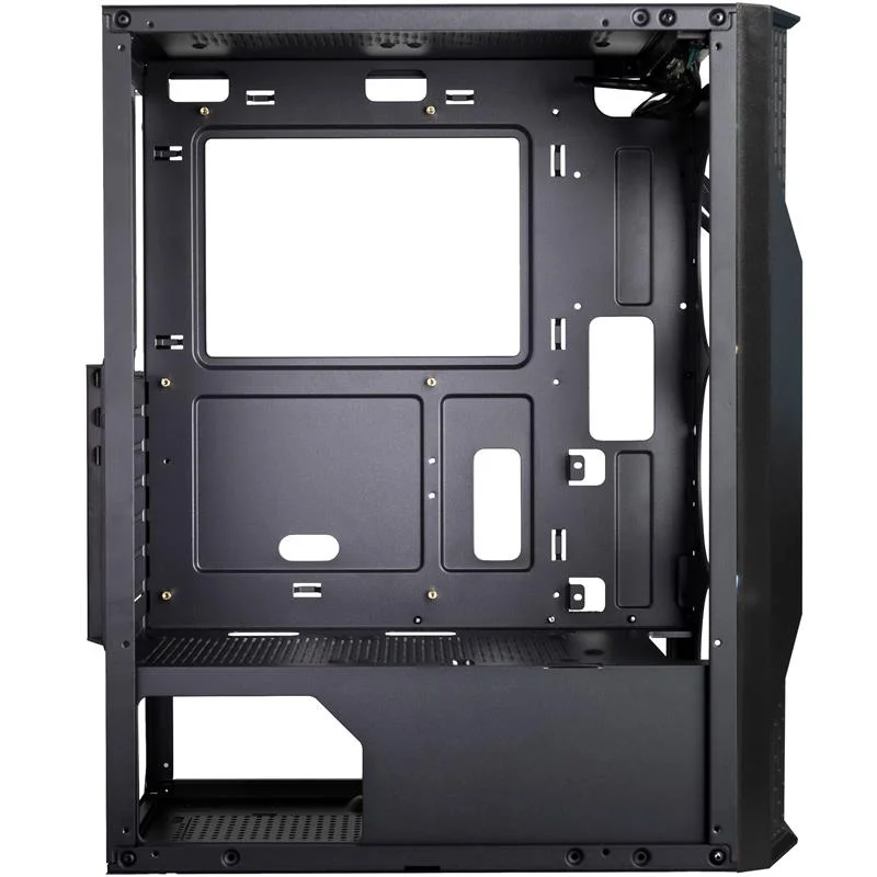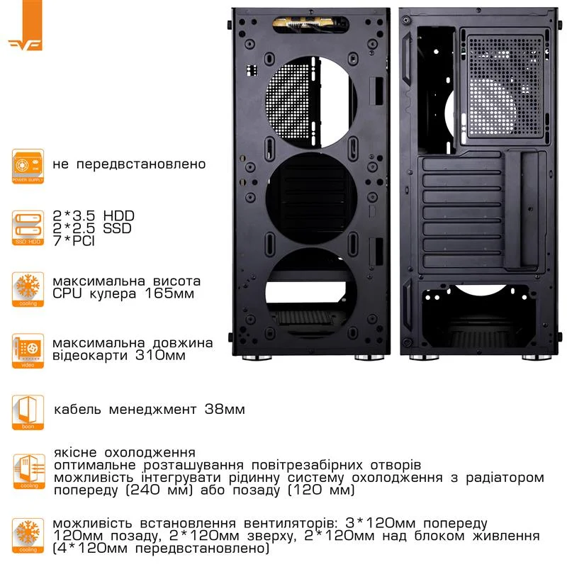 Frime Legion - це корпус для складання потужного ігрового комп’ютера. Відмінне охолодження забезпечують 3 комплектних LED вентилятора, розташовані за напівпрозорою передньою панеллю з оригінальними декоративними ґратчастими елементами, 1 вентилятор на задній панелі. Для кращої вентиляції передня панель обрамлена рамкою з прорізами, а верхня панель являє собою вентиляційну решітку. Ліва бічна панель також напівпрозора, завдяки чому відмінно проглядається внутрішня конфігурація, що дозволяє використовувати при її складанні сучасні комплектуючі з підсвічуванням. Корпус Frime Legion можна розміщувати нижче робочої поверхні, тому що всі найбільш затребувані роз’єми розташовуються на верхній панелі і доступ до них навіть з положення "сидячи" зручний. Однак при такому варіанті розміщення над корпусом має бути достатньо простору для природної вентиляції, адже верхня панель забезпечує додатковий доступ повітря, і для комфортного підключення пристроїв, наприклад, флеш-накопичувачів. Яскравий і стильний як в працюючому, так і у вимкненому стані, корпус Frime Legion здатний стати надійною основою комп’ютера вдома або в офісі.