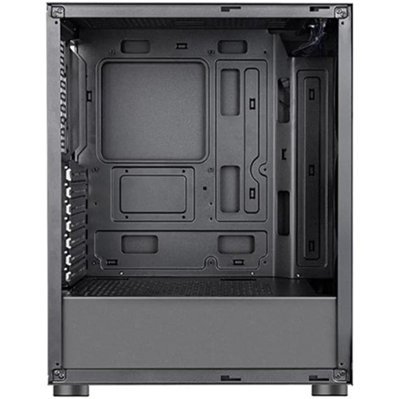 Ігровий корпус. Ліва прозора панель. Повний огляд ігрової системи. Нижнє розташування блоку живлення, протипилова сітка-фільтр. Установка SSD за 10 секунд. Надійні високі пластикові ніжки для поліпшення охолодження. Інноваційна система прокладки кабелів позаду материнської плати Жорстка (сталь SECC 0.6-0.7 мм), чорна конструкція шасі. Оброблені кутові з"єднання. Поліпшений захист від електромагнітних перешкод.