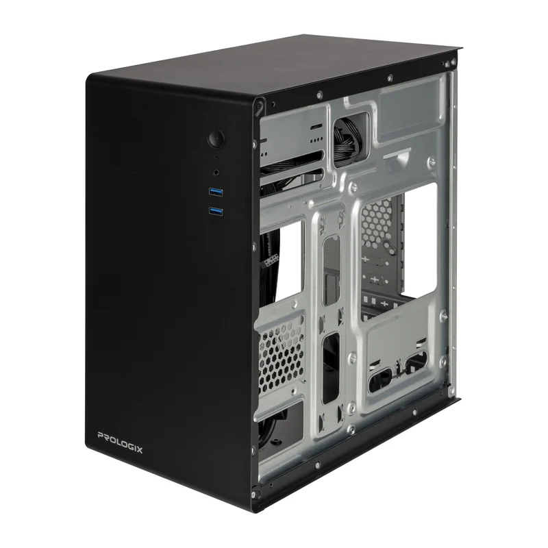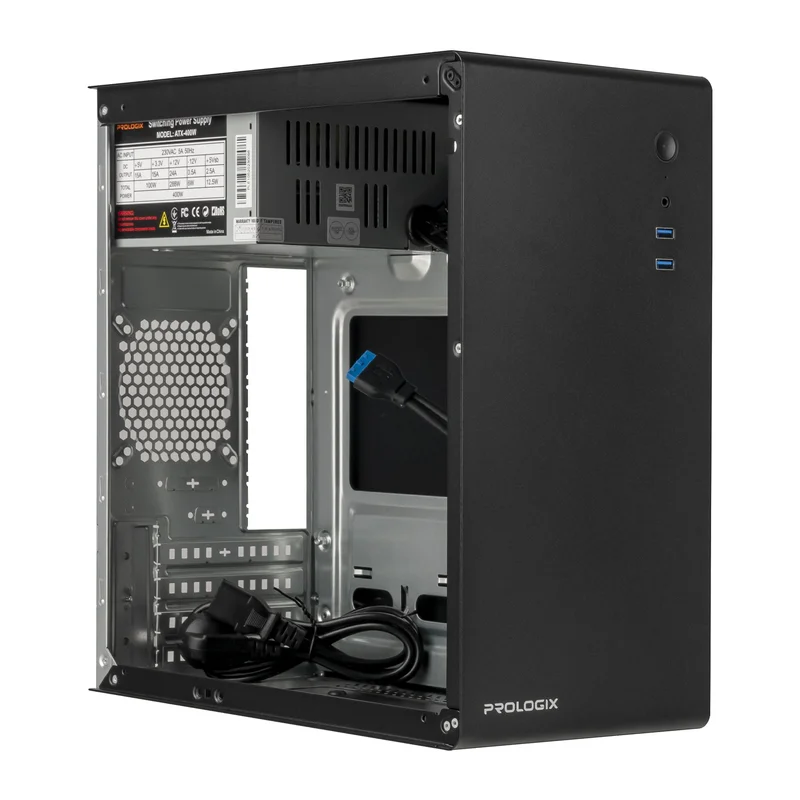 Корпус Prologix E105 Black 400W Оптимальна основа для збірки ПК — корпус Prologix E105 Black 400W. Взявши його, користувач отримає конфігурацію, яка найбільшою мірою відповідає індивідуальним вимогам. Він виготовлений з листового металу завтовшки 0,4 мм, що надійно захищає компоненти від зовнішніх впливів. Кромки ретельно згладжені, що виключає ймовірність травматизації під час роботи. Компактні габарити в 170х350х330 мм і вага в 3,3 кг не створять проблем з транспортуванням і переміщенням. Класичний дизайн елегантного чорного корпусу з сітковою перфорацією на бічній панелі забезпечує відмінну вентиляцію всередині кейса (щоб уникнути перегріву). Розумний користувач вибере модель E105 Black 400W завдяки її перевагам: - на базі Prologix E105 Black 400W можна зібрати професійний або домашній настільний комп'ютер; - дає змогу встановити оптимальні системи вентиляції та охолодження; - лаконічне виконання; - верхнє розміщення блока живлення та панелі підключення; - прийнятна вартість. Бюджетна модель формату Minitower не займає зайвий простір і досить містка для монтажу всіх необхідних комплектуючих, що відповідають запитам власника. Гармонійний зовнішній вигляд, продуманий функціонал і ергономічна конструкція полегшать самостійне встановлення якісних запчастин. Зручні кнопки, два USB-порти 3.х і роз'єм для під'єднання аудіогарнітури розташовані на фасаді. Біля верхньої стінки корпусу вмонтовано фірмовий блок живлення потужністю 400 Вт. Таке розташування гарантує захист елементів ПК від пилу. Передбачено електричний захист - OPP/OVP/UVP/SCP.