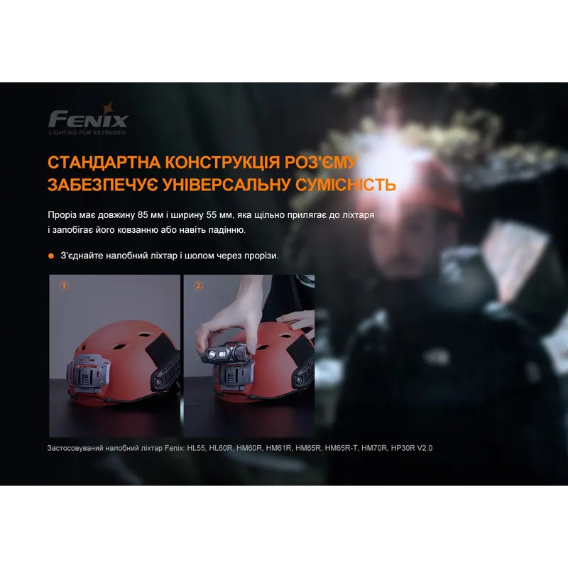 - сумісність з налобними ліхтарями Fenix HL55, HL60R, HM60R, HM61R, HM65R, HM65R-T, HM70R та HP30R V2.0;