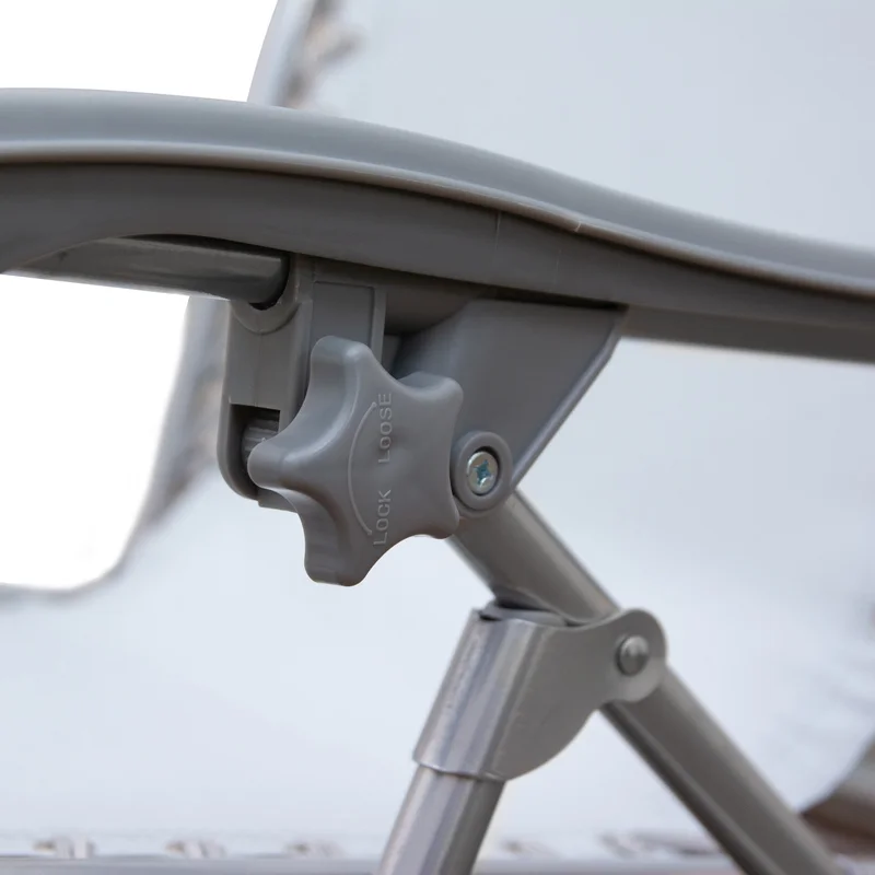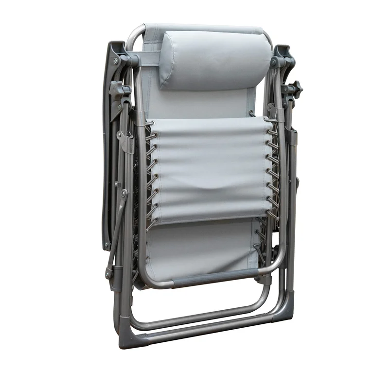 Конструкція проста і ефективна — крісло легко складається/розкладається, забезпечуючи комфорт користування, транспортування та зберігання. Виріб обладнаний механізмом регулювання кута нахилу спинки— доступні варіанти від сидячого до напівлежачого положення. Також у комплект входить зручна подушечка-підголівник, що регулюється по висоті та кріпиться на резинці.