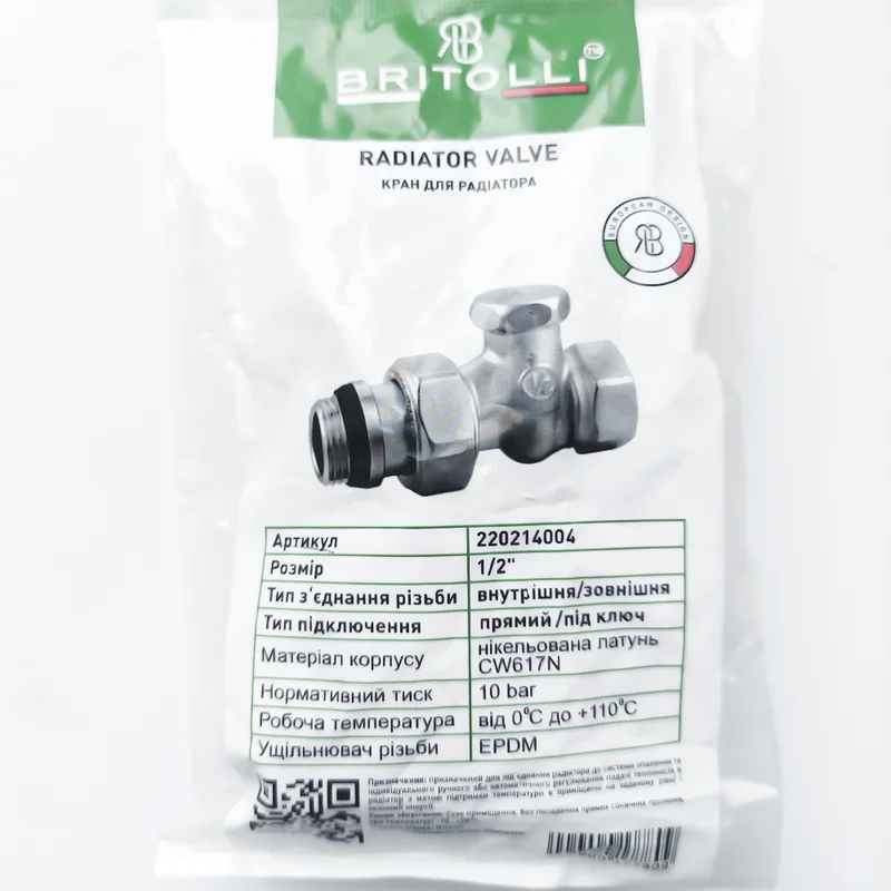 Радіаторний кран Britolli 1/2'' — надійний і зручний елемент системи опалення, призначений для підключення радіаторів. Виготовлений з міцної нікельованої латуні, стійкої до корозії та високих температур. Пряма конструкція забезпечує легкий монтаж у горизонтальних трубопроводах, а накидна гайка та зручна шестигранна форма під ключ спрощують установку та демонтаж. Ідеально підходить для використання в побутових і промислових системах опалення.