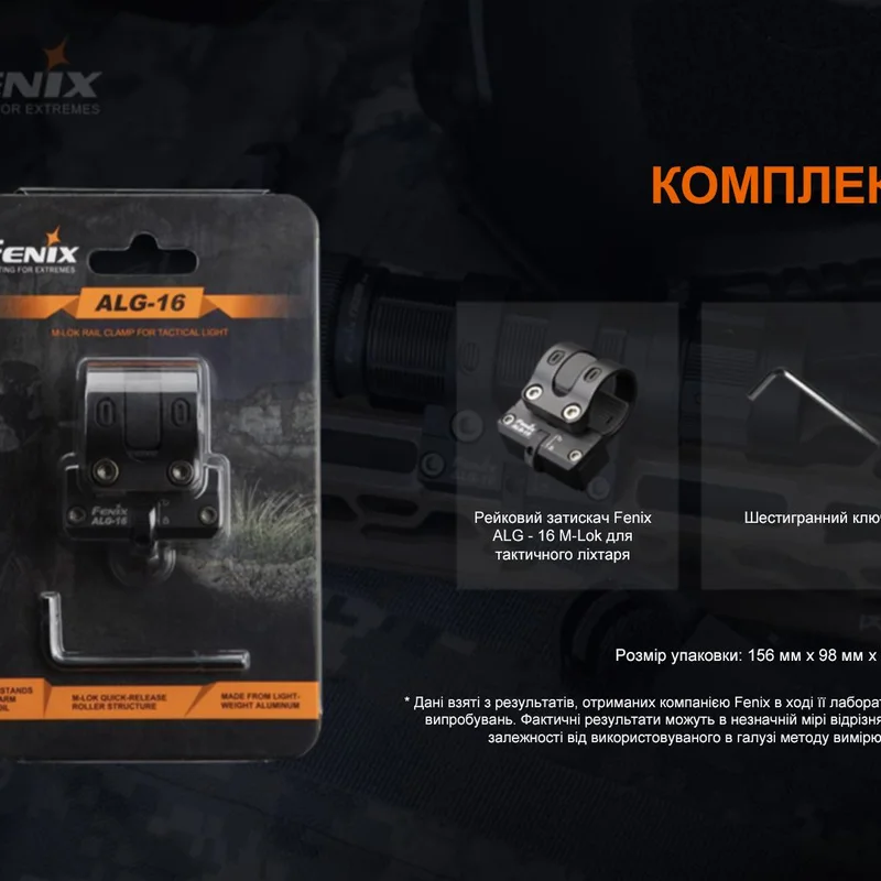 В упаковці габаритами 156 х 98 х 34 мм знаходиться кріплення Fenix ALG-16 та шестигранний ключ.