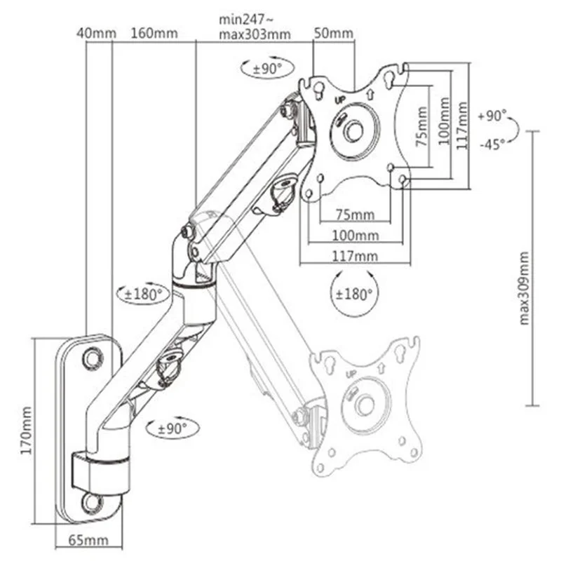 Особливості Настінний кронштейн для монітора з одним кріпленням Кронштейн обертається, висувається та втягується, нахиляється для зміни кута читання та дозволяє повертати дисплей з альбомного положення до портретного тощо Забезпечує просте ергономічне позиціонування для зниження навантаження Працює практично з будь-яким РК-монітором (макс. 27 дюймів) Міцна регульована пружина підходить для моніторів вагою від 2 до 7 кг Вбудована система кабельменеджменту для організованого та акуратного робочого простору Сумісність з VESA (100 x 100 мм та 75 x 75 мм)