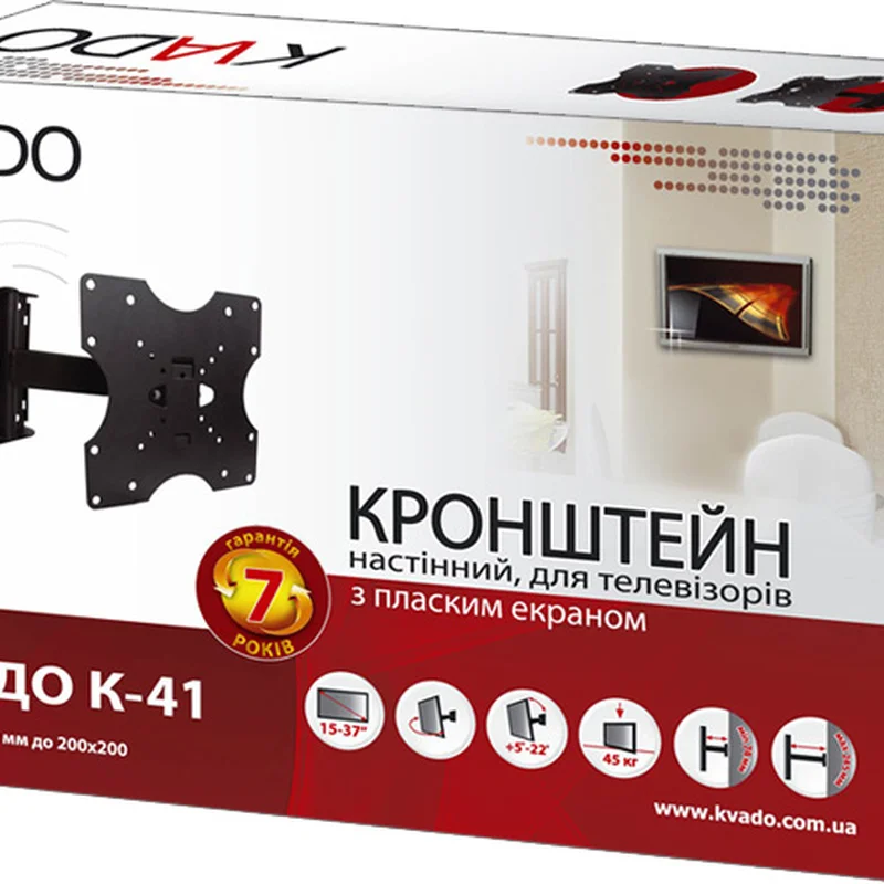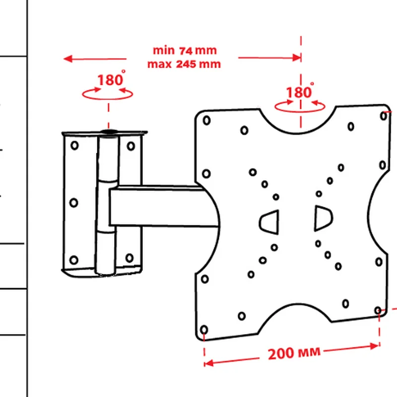 Кронштейн дозволяє встановити телевізор із можливістю винесення від стіни на відстань до 240 мм. Сумісний зі стандартами VESA: 50x50mm, 75x75mm, 100x100mm, 200x100mm, 200x200mm. Легке встановлення телевізора на кронштейн: пластина, яка кріпиться до телевізора - знімна, що дозволяє легко прикріпити її до телевізора та навісити на кронштейн. Для більшої надійності пластина фіксується гвинтом.