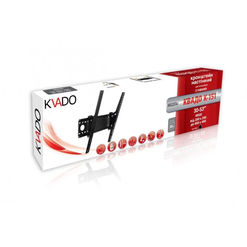 Універсальний кронштейн КВАДО К-151 поєднує в собі елегантний дизайн та надійність. Ідеально підходить для легких, сучасних телевізорів з великими та средніми діагоналями, вагою до 35 кг. Має функцію нахилу, кут огляду змінюється від руки, плавно, без зусиль. Підходить для добре освітлених приміщень.