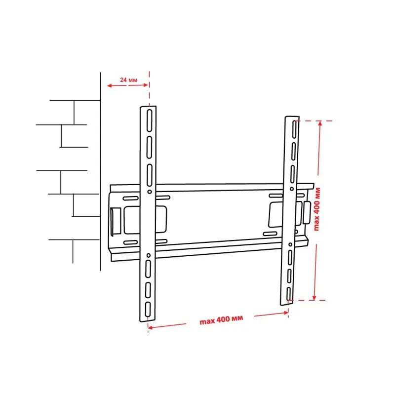 Фіксований кронштейн для величезних діагоналей телевізорів. Універсальна низькопрофільна конструкція кріплення. Розмір кріплення: від 200x200 мм до 400x400 мм, включаючи всі проміжні розміри. Переваги фіксованого кріплення: його простота, надійність та невелика відстань від стіни. Сумісність із VESA та більшістю телевізорів, що не відповідають стандарту VESA.
