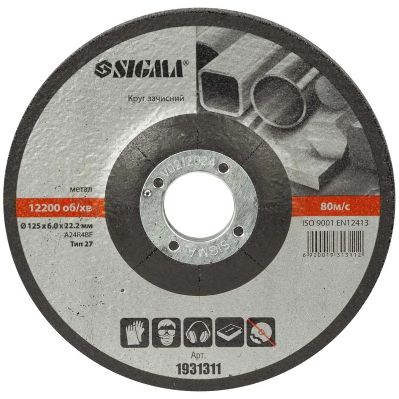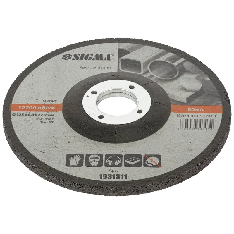Круг зачисний по металу Ø125×6.0×22.2мм, 12200об/хв SIGMA (1931311) застосовується для шліфування зварних швів і з'єднань після зварювання, для зачистки поверхонь і кромок перед зварюванням, обдирання окалини та видалення іржі.
