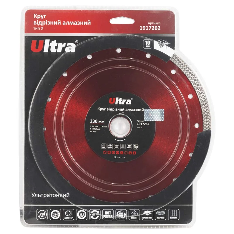 Круг відрізний алмазний тип Х Ø230×25.4 (22.2)мм ULTRA (1917262) призначений для різання потовщеного граніту та керамограніту, кахлю, плитки, мармуру. Корпус виготовлений із міцної сталі, здатної витримати значне механічне навантаження та високу температуру.