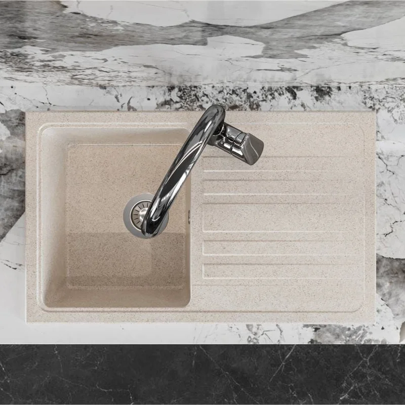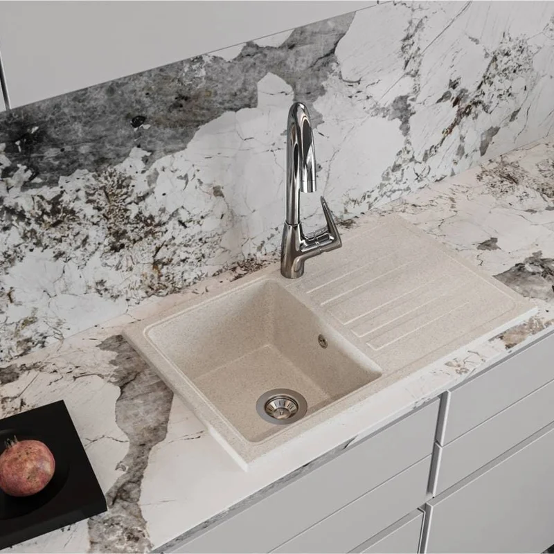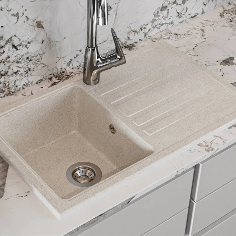 Кухонна мийка VERSAL sand має однорідну текстуру та колір. Вона не всочує запахи, відштовхує жир та забруднення,  а також не змінює кольору в процесі експлуатації.