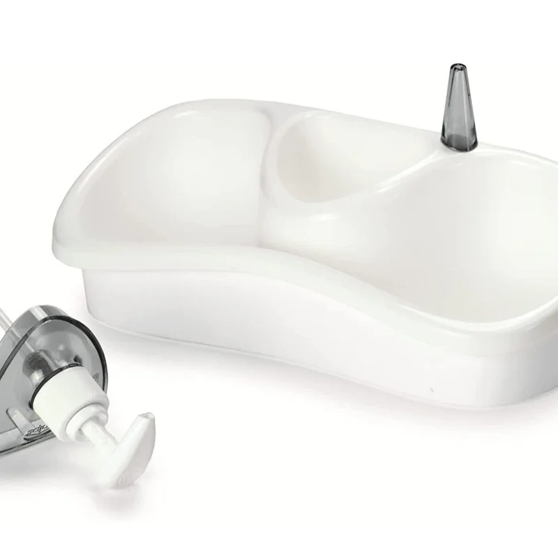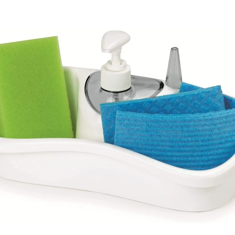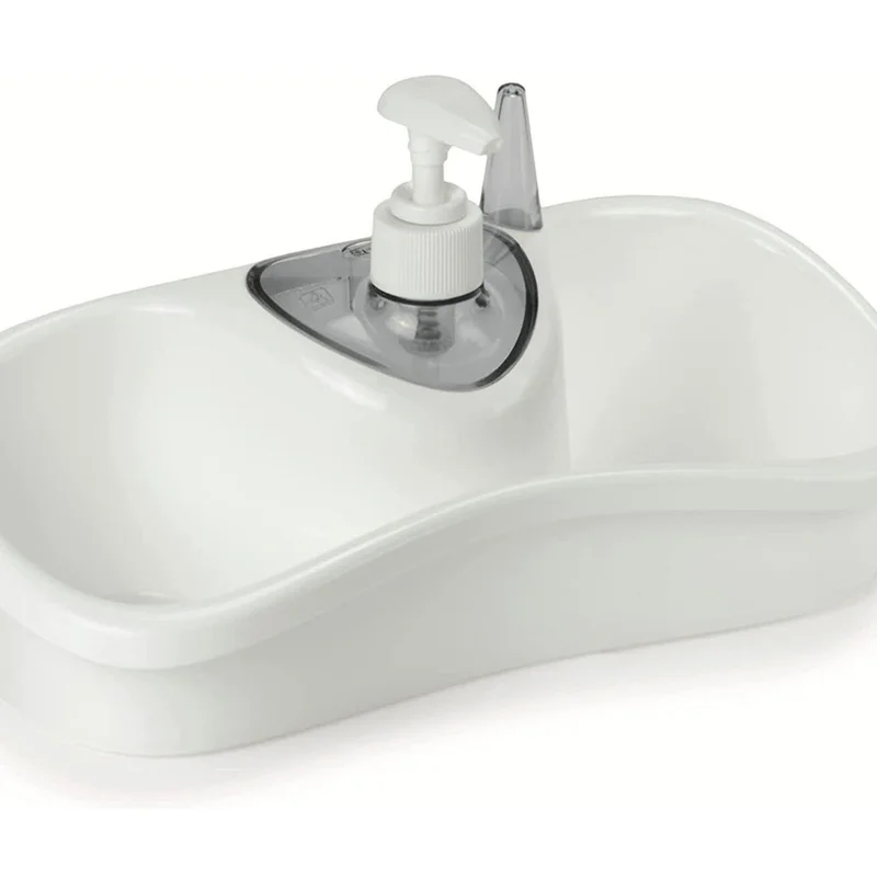 Ергономічність та функціонал органайзера полягає у поєднанні в одному виробі: багаторазового дозатора для рідкого мила або засобу для миття посуду та двох містких бокових відділень для зберігання губок, ганчірок, перчаток тощо. Додаткова зручність користування забезпечена тримачем для кілець, завдяки якому ваші прикраси зберігатимуть первозданний вигляд, уникаючи зайвого контакту з водою. Також виріб підходить для миття та дезінфекції у посудомийній машині.