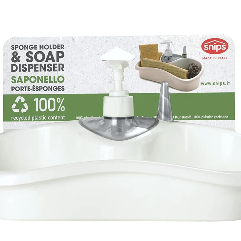 Кухонний аксесуар з ємністю для зберігання та рідкого мила Snips — екологічно чистий продукт, виготовлений з переробленого пластику, що також підлягає повторній вторинній переробці.