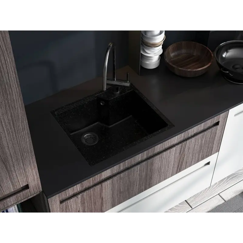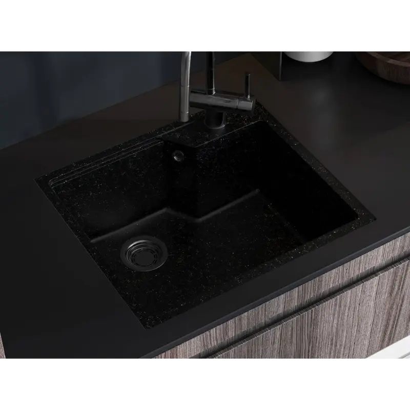 Кухонна мийка LISA black на 80% складається з кварцевого піску та на 20% з поліефірної смоли, що забезпечує міцність цього виробу. Кухонна мийка витримує перепади температур від -65 до +65°C та не підається впливу агресивних побутовик фарбників.