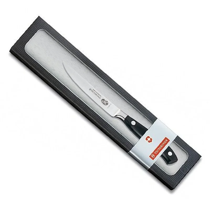 Ніж столовий обробний Victorinox GrandMaitre 12 см загартована сталь 7.7203.12 G - це кований швейцарський кухонний ніж для стейків, який стане незамінним помічником для будь-якої господині. Вузький клинок зручно використовувати для порціонної нарізки смаженого або запеченого м'яса. Ніж має гостре сталеве лезо і ергономічну пластикову ручку на трьох заклепках. Ніж поставляється в подарунковій упаковці.