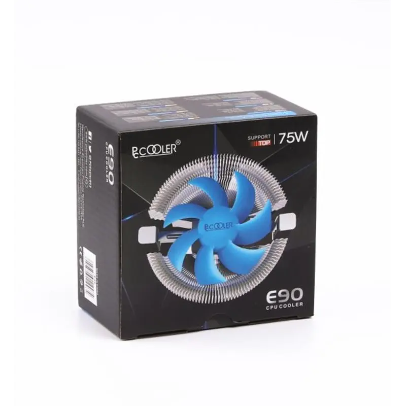 Кулер для процесора PCCooler E90 позиціонується як система відводу тепла для ЦПУ з найбільшим тепловиділенням на рівні 75 Вт. Експлуатація універсального кулера можлива з процесором на сокеті LGA 1151-v2, LGA 1156, AM3, LGA 1155 або ряді інших. У даній моделі використовуються підстава з алюмінію, нікельований алюмінієвий радіатор і вентилятор розміром 90x90 мм з аеродинамічною формою лопатей, що відрізняється малою гучністю роботи. При робочої шумності не більше 18 дБ кулер відмінно підійде для малошумної збірки.