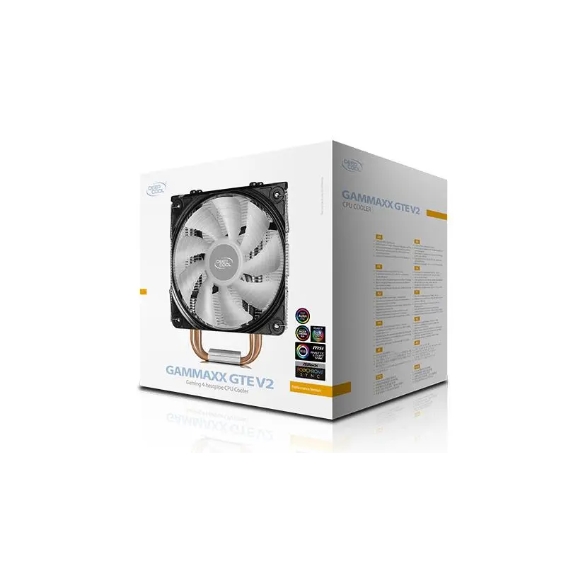 Чорна верхня панель з унікальним принтом.120-мм ШІМ-вентилятор з поліпшеною продуктивністю і RGB-підсвічуванням.Система освітлення може контролюватися материнською платою.Чотири теплових трубки, виготовлених за новою технологією, володіють поліпшеним теплообміном і ефективністю розсіювання.Новий процес монтажу пластин радіатора забезпечує поліпшену вентиляцію.Абсолютно новий монтажний комплект із захистом від неправильного поводження робить GAMMAXX GT A-RGB зручнішим і безпечнішим у використанні.