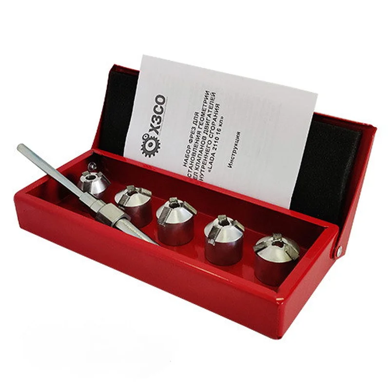 Набір фрез для відновлення геометрії сідел клапанів ДВС "LADA 2110 16 кл." (ХЗСО) SVCK1010 Набір фрез (шарошок) призначений для відновлення геометрії сідел клапанів двигунів внутрішнього згоряння автомобілів.Фрези мають у своїй конструкції різальні ножі з фіксованим положенням, тобто нерегульовані положення щодо корпусу фрези. Конструкція та розміри фрез дають змогу обробляти сідла клапанів, забезпечуючи значення кутів і діаметрів відповідно до рекомендацій заводу виробника двигуна.Виробник набору фрез гарантує, що за дотримання всіх умов інструкції, різальний інструмент слугуватиме тривалий термін і принесе максимальний прибуток. Перед початком використанням фрез необхідно ознайомитися з інструкцією. Комплектність набору фрезНабір складається з різального інструменту — фрез (шарошок), з різними діаметрами та кутами, а також напрямного стрижня (пілота). Набір фрез дає змогу обробляти фаски сідел клапанів, двигунів автомобілів сімейства LADA 2110 16 кл, забезпечуючи такі кути, рекомендовані заводом виробником:A 45º, B 30º, C 30º Характеристики:Діапазон оброблюваних діаметрів сідниць клапанів:16-31, 17.7-27, 19.1-31, 15.8-27, 19-29 ммКути фрез, o:60º; 90º; 120ºДіаметр напрямного стрижня (пілота), мм:8Ширина робочої фаски сідла клапана, мм:впускного 1.3-1.5 і випускного 1.6-1.8 Комплектація:Фреза 30A 120º Фреза 30G 120º Фреза 45D 90o 2 шт. Фреза 60A 60º Напрямний стрижень (пілот) діаметром 8 мм із гайкою
