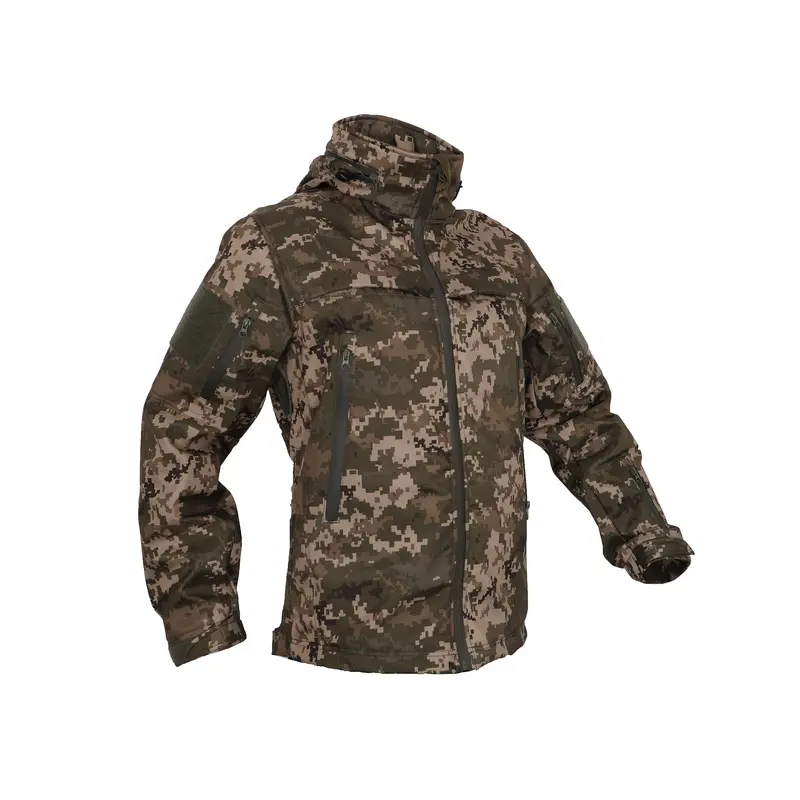 Тактическая куртка softshell Pancer пиксельной расцветки Тактическая куртка софтшелл Pancer Protection пиксельной расцветки по своему крою соответствует требованиям к одежде для военнослужащих. Куртка пошита из ткани softshell, технологичного материала, который позволяет сделать одежду более легкой и менее объемной благодаря соединению в едином полотне верхнего слоя и подкладки. Внутренняя часть представлена мягким флисом, который удерживает тепло и пропускает воздух. Снаружи непромокаемая ткань, создающая непреодолимое препятствие для ветра. Теплоизоляционные свойства обеспечиваются способностью флиса не впитывать влагу, а выводить не внешний слой, где происходит быстрое испарение. Ткань прочная на разрыв, не протирается, не деформируется во время стирки и быстро сохнет. Крой тактическая куртка soft shell Pancer Protection разработан для военных: Прямой силуэт не стесняет движений. Высокий воротник и капюшон защищают от ветра и дождя, капюшон отстегивается. Боковые карманы и небольшие карманы на рукавах застегиваются на молнии. В нагрудной части расположены карманы с пластиковой вставкой для документов, они могут располагаться как внутри куртки, так и снаружи. Манжеты на рукавах регулируются липучками. На плечах нашиты велкро-панели для шевронов. В районе подмышек вшиты молнии для дополнительного проветривания. Купить тактическую куртку софтшелл Pancer Protection можно на сайте компании, воспользовавшись корзиной, кнопкой быстрого заказа или бесплатными телефонами для связи. Оплатить покупку можно наличными, картой, безналичным расчетом. Отправка покупок осуществляется ежедневно национальными транспортными компаниями, в Киеве работает курьерская доставка.