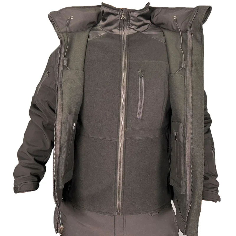 Тактическая куртка со съемной подкладкой (черная) Описание:Мужская тактическая куртка идеально подходит для экстремальных погодных условий и активных задач на свежем воздухе. Изготовлена из прочного, водоотталкивающего материала, она обеспечивает защиту от ветра и влаги. Модель представлена в универсальном черном цвете, который прекрасно сочетается с любым стилем и типом одежды. Основные особенности: • Материал: Водоотталкивающий полиэстер, защищающий от дождя и ветра.• Крой: Эргономичный крой, обеспечивающий свободу движений, что особенно важно в условиях тактических задач или активного отдыха.• Капюшон: Прячущий капюшон с регулировкой, который можно адаптировать под любые погодные условия.• Молнии: Высококачественные молнии с защитой от влаги.• Карманы: Множество карманов на молнии, включая карманы на рукавах и груди для удобного размещения мелких предметов.• Манжеты: Регулируемые манжеты на липучках для защиты от ветра и оптимальной посадки.• Съемная кофта: Внутренняя теплая флисовая кофта, которую можно снять, делая куртку более универсальной для разных сезонов. Идеально подходит для: • Тактических задач• Военной службы• Походов и активного отдыха• Городского использования в холодное время года Эта тактическая куртка сочетает в себе функциональность, стиль и надежность, предоставляя максимальный комфорт даже в самых сложных условиях.