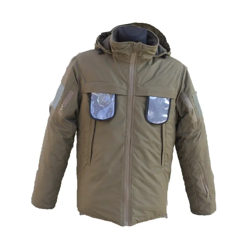 2 больших кармана (внутри карабин и дополнительные карманы для телефона и разных мелочей) на груди еще 2 кармана (на липучке сьемные непромокаемые чехлы под значек, погон, удостоверение ) на рукавах по карману