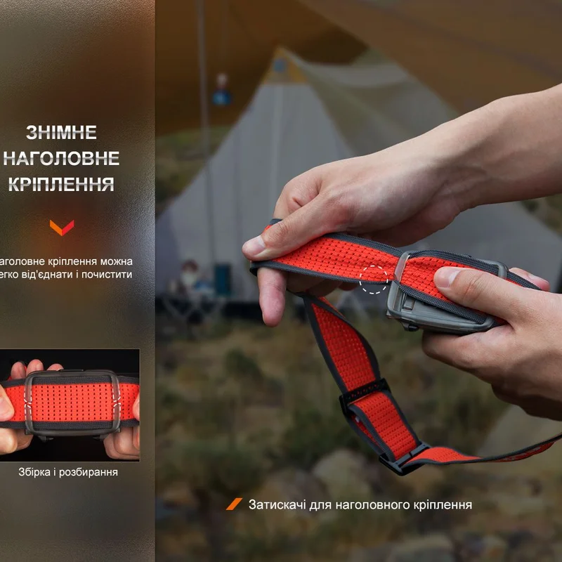 Ліхтар укомплектований фірмовим налобним кріпленням шириною 36 міліметрів. Перфороване оголов'я має оптимальну повітропроникність, щоб запобігти появі неприємного відчуття попрілості шкіри. Довжину резинки можна змінити за допомогою регулятора. По всій довжині кріплення розташовані світловідбивні елементи, які роблять користувача видимим у темний час доби, наприклад, коли він переходить автомобільну дорогу.