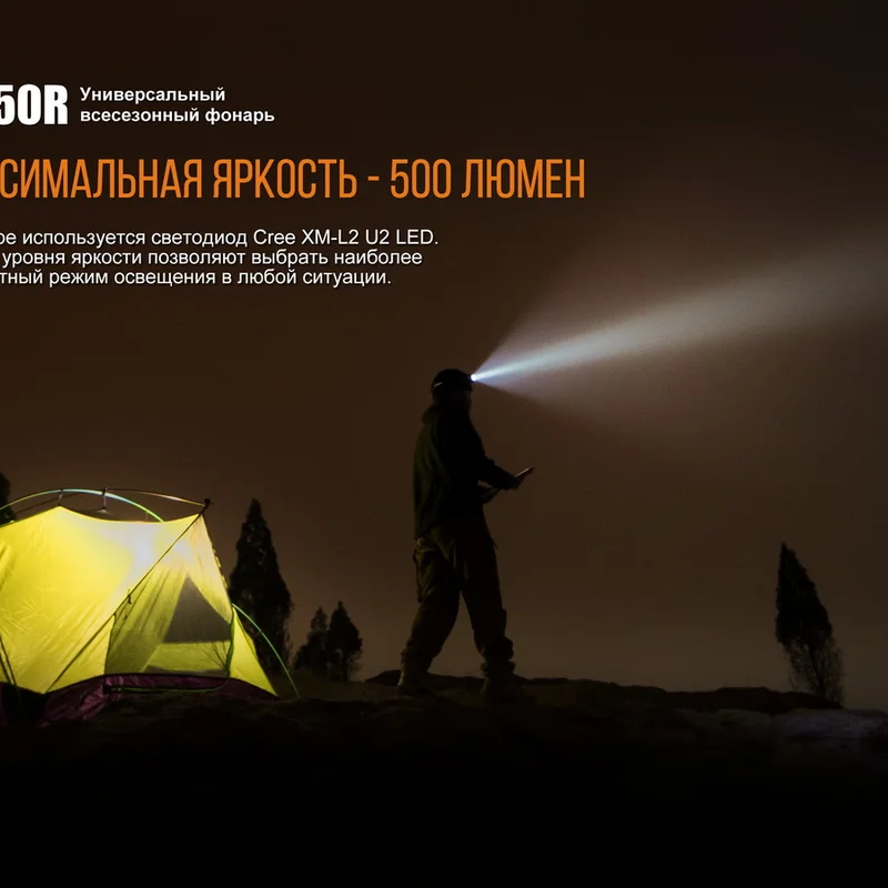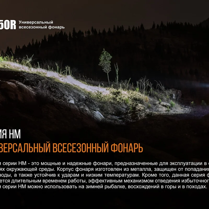 HM50R — вдала модель налобного ліхтаря для поїздів на природу навіть в умовах несприятливої погоди. Цей ліхтар точно підійде альпіністам, спелеологам, туристам, любителям зимових поїздок на риболовлю. Він використовує потенціал світлодіода XM-L2 U2 і може давати світло яскравістю аж до 500 люмен. Ця модель підтримує 4 режиму, кожен з яких відрізняється яскравістю постійного променя. Це може бути 500, 130, 30 або 4 люмена. Від яскравості залежить і дальність променя. Вона варіюється в межах 6-80 метрів. Тривалість використання ліхтаря в автономному режимі залежить від того, який елемент живлення був обраний користувачем. В комплекті вже є акумулятор фірмового виробництва ARB-L16-700 літій-іонного типу. Його при мінімальній яскравості вистачить на 90 годин освітлення. Якщо ж скористатися літієвою батареєю CR123A, то ліхтар зможе працювати до 128 годин.