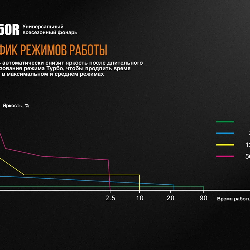 Є кілька факторів, які можуть вплинути на тимчасове зниження яскравості світла, щоб ліхтар HM50R міг працювати повністю справно. По-перше, це можливий перегрів обладнання. Якщо температура всередині HM50R зросте більш, ніж 65°С, дана модель відразу ж знизить яскравість світла. По-друге, яскравість зменшиться у разі розрядження акумулятора. Крім того, спеціальний механізм усього на кілька люмен знизить яскравість світла, якщо користувач тривалий час не змінює режим, щоб ліхтар пропрацював ще довше.