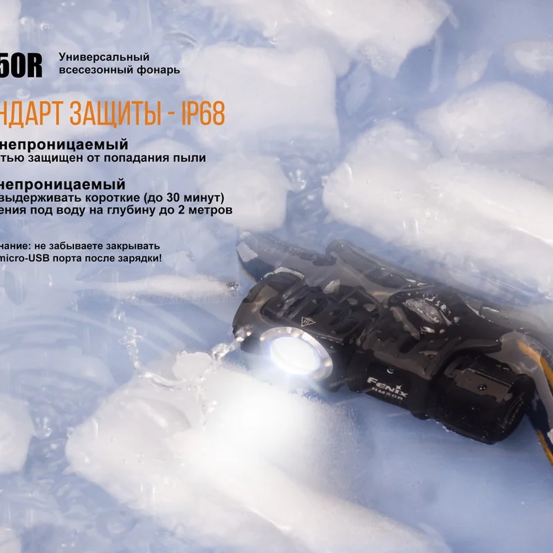 У даній моделі є й інші захисні механізми. В тому числі, HM50R не страшні короткі замикання, ліхтар не схильний до переполюсовке. В якості захисного механізму виступає і оболонка цього ліхтаря. Вона повністю алюмінієва, що наробить HM50R великою міцністю і запобігає розвитку корозії. Водонепроникність і захищеність від пилу у даної моделі найбільш висока, що підтверджується стандарту IP-68. Тому його без проблем можна включати в будь-який час року і абсолютно при будь-якій погоді.