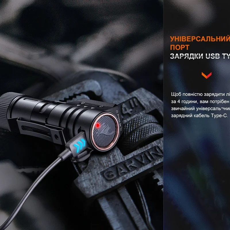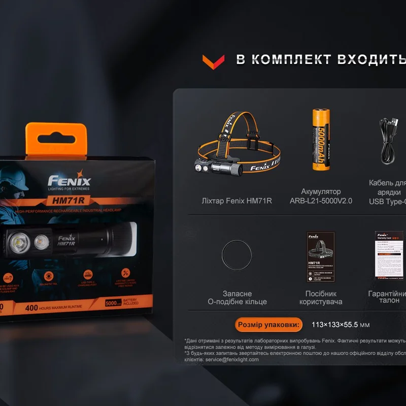 Крім ліхтаря Fenix HM71R, гарантійного талону та інструкції до комплекту входить запасне ущільнювальне кільце, літій-іонний акумулятор 21700/5000 мАгод і кабель USB Type-C для заряджання.