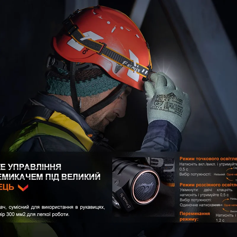 Модель HM71R має стандартне для налобних ліхтарів Fenix керування за допомогою одного перемикача. Кнопка знаходиться в голові корпусу і легко намацується рукою навіть у щільній рукавичці, оскільки має великий розмір та текстуровану поверхню.