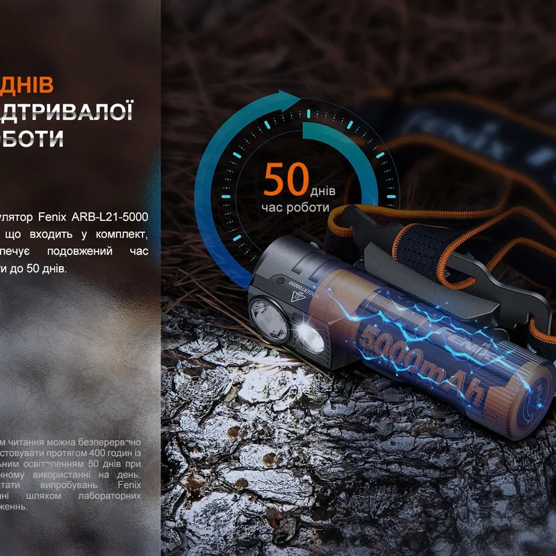 Для живлення моделі підходить літій-іонний акумулятор форм-фактору 21700 — ARB-L21 (5000 мАгод) виробництва Fenix. Використання акумуляторів інших брендів не рекомендується, оскільки це позбавляє користувача можливості активувати режим Turbo і може стати причиною виходу ліхтаря з ладу. Робоча напруга моделі становить 3.7 В.