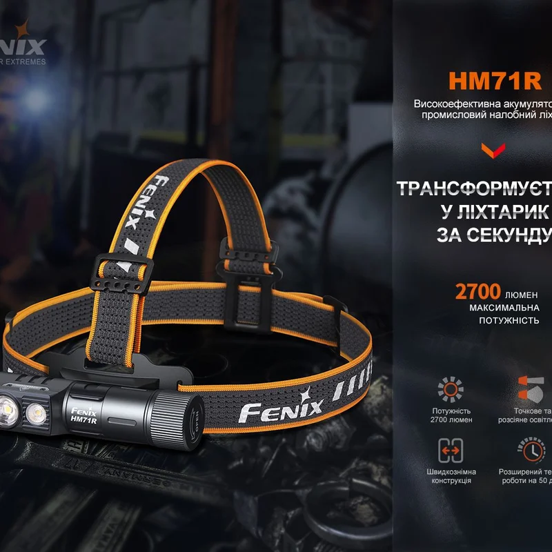 Налобний ліхтар Fenix HM71R підходить для використання як у промислових приміщеннях, так і на відкритому просторі. Інтерфейс включає ряд режимів із спрямованим, далекобійним світлом та ближнім освітленням із широким променем найбільшою яскравістю 2700 люменів.