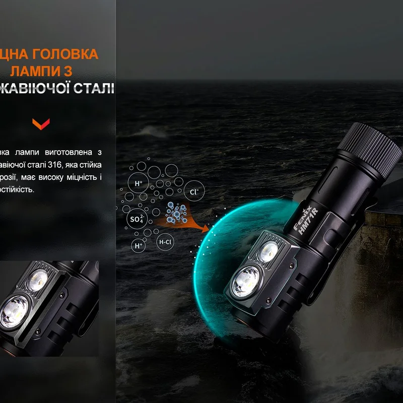 Корпус Fenix HM71R виготовлений з двох металів: голова конструкції — з нержавіючої сталі 316, а інша частина — з анодованого алюмінію А6061-Т6. Обидва матеріали мають стійкість до механічного впливу і успішно справляються зі своєю функцією — захистом внутрішньої електроніки від пошкоджень.