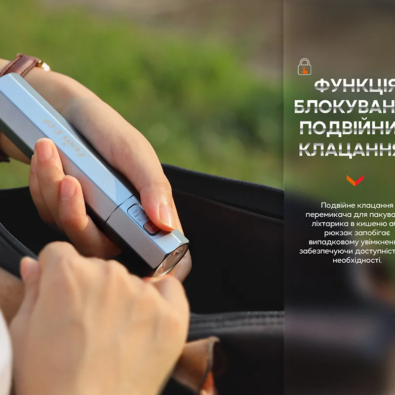 Блокування: при розблокованому та вимкненому ліхтарі двічі клацніть перемикач протягом 0,5 секунд, щоб заблокувати модель. Вона двічі блимне в Low режимі, вказуючи, що тепер заблоковано. Розблокування: при заблокованому ліхтарі двічі клацніть кнопку протягом 0,5 секунди, відбудеться розблокування, і ліхтар одразу ввімкнеться у режимі Eco. Під час заряджання ліхтаря він також буде розблокований.