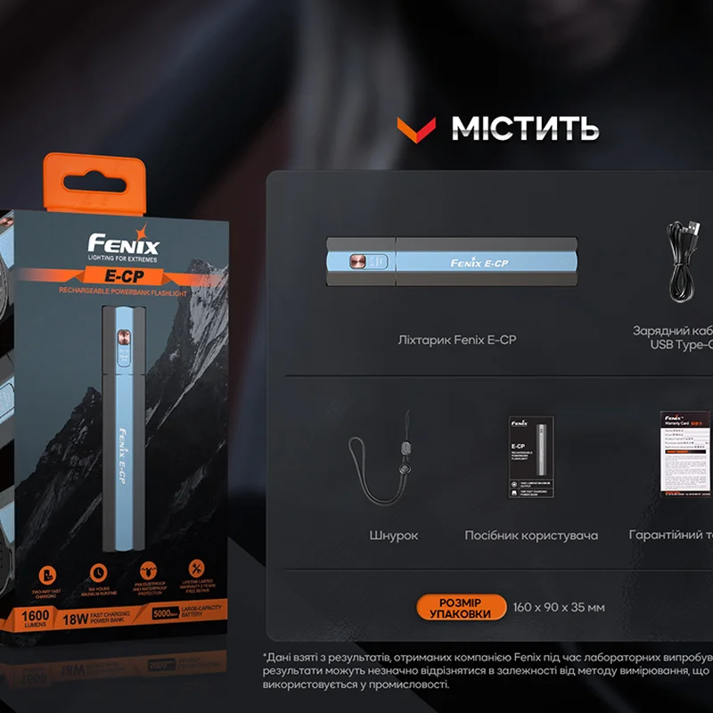 Комплектація: ліхтар Fenix E-CP, кабель USB Type-C зарядний, темляк, інструкція до експлуатації, гарантійний талон.