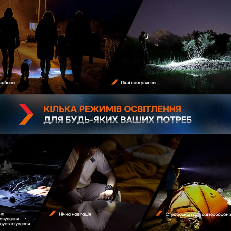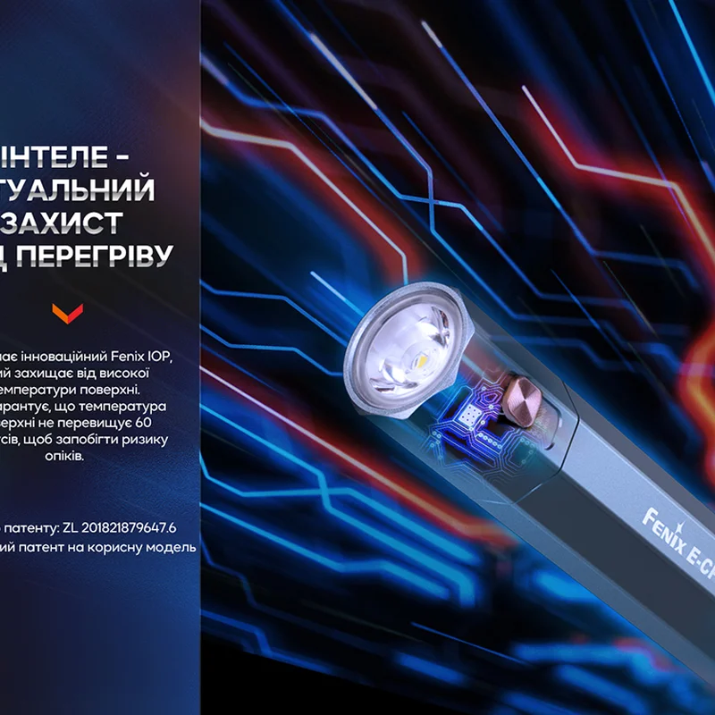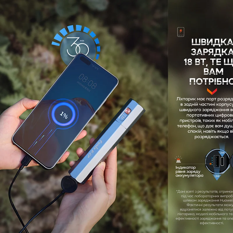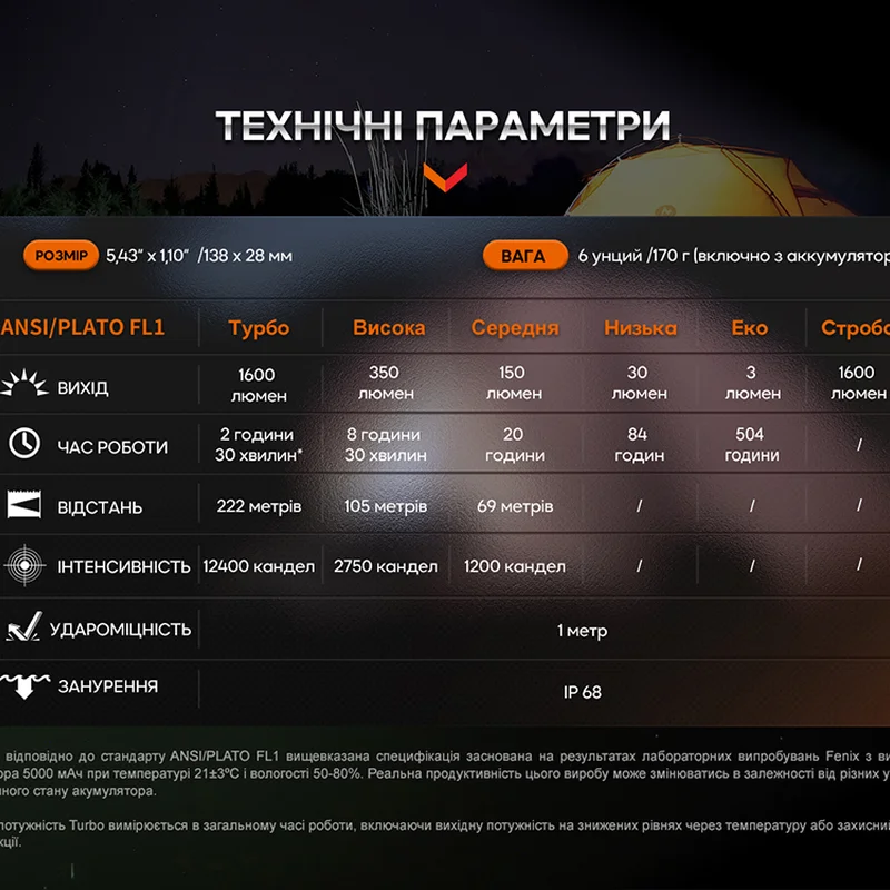 Примітка: показники світіння моделі ґрунтуються на результатах, отриманих фірмою Fenix під час лабораторних дослідів із застосуванням літій-іонного акумулятора ємністю 5000mAh при температурі 21±3°C та вологості 50% - 80%. Реальні параметри роботи ліхтаря можуть відрізнятися залежно від різних умов зовнішнього середовища та акумулятора, що застосовується.