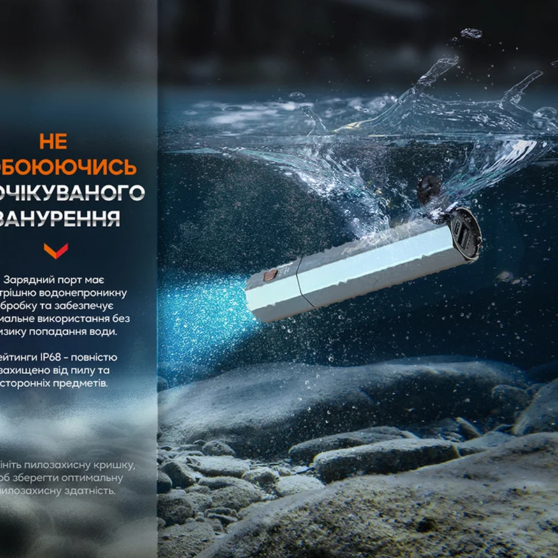 - дієвий захист від зовнішніх факторів – легко переносить падіння з 1,5 метрів та занурення на глибину до 2-х метрів. Перевірено у процесі дослідів у лабораторії Fenix.
