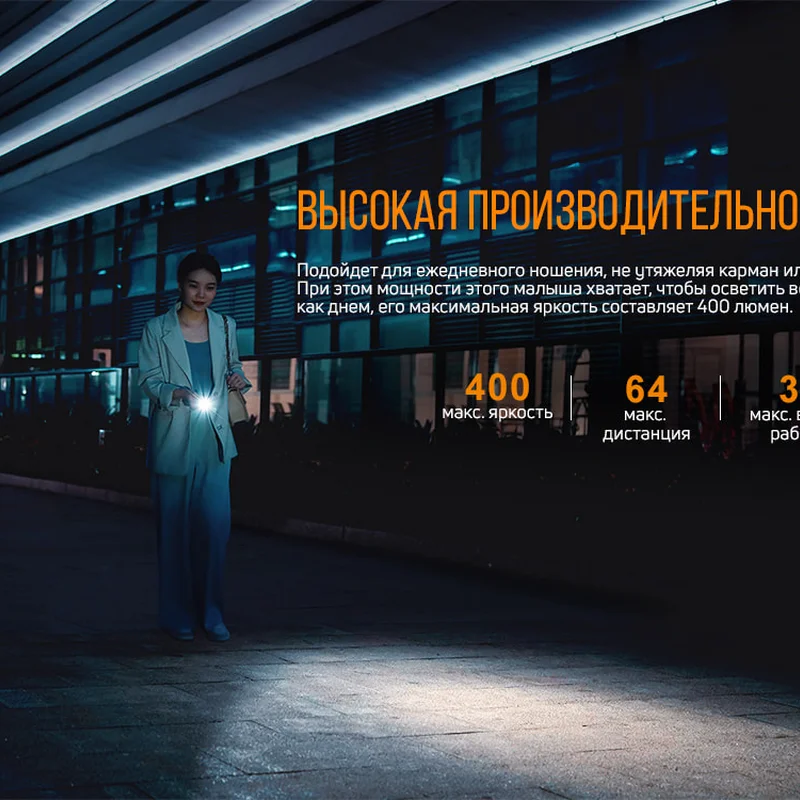 - Турбо. У цьому режимі ліхтар здатний видати максимальне значення яскравості, 400 люменів. Далекобійність променя досягає 64 метрів. Інтенсивність світлового потоку становить 1046 кандел.