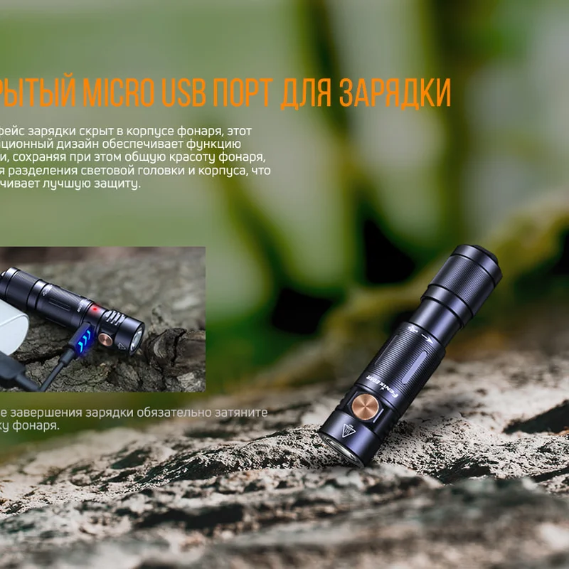 Для зарядки тут є прихований micro-USB порт. Також передбачена високоефективна лінза з повним відбиваючим покриттям. Для включення і виключення ліхтарика, а також для вибору режиму є металева кнопка. Чотири різних рівня яскравості.