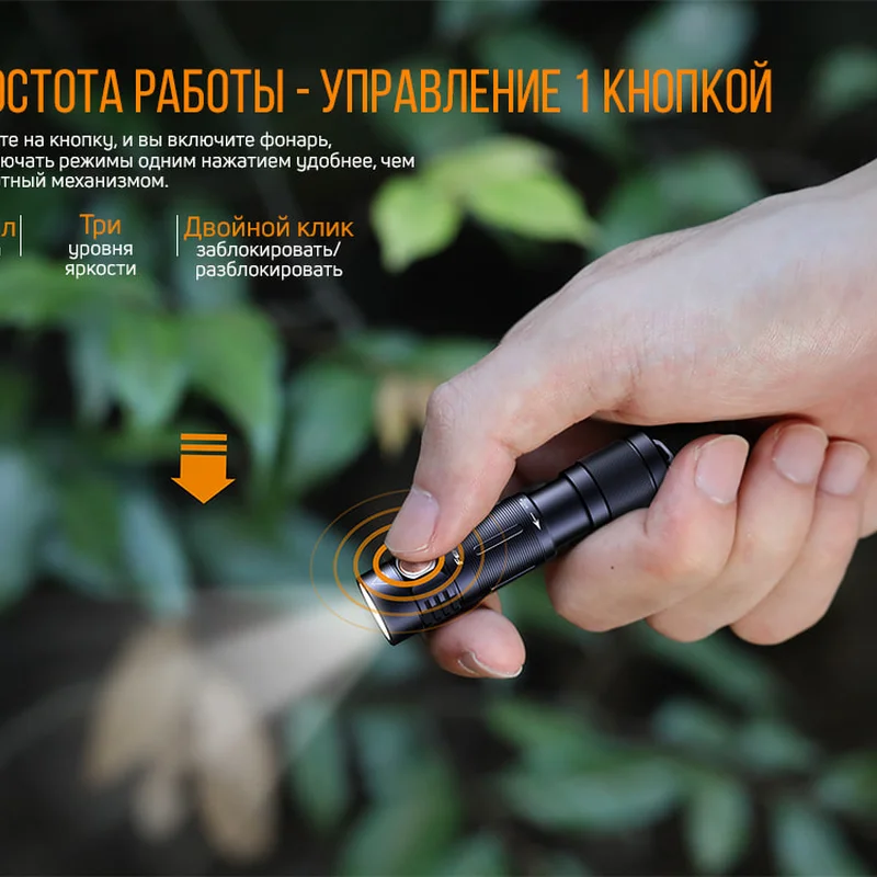 Для включення або виключення Fenix E05R слід затиснути і потримати бічний перемикач півсекунди. Для вибору режиму при включеному ліхтарі одноразово затисніть бічну кнопку. Тим самим ви зможете активувати режим: мінімальний→середній→максимальний. Якщо ж необхідно задіяти миттєвий Турбо, для цього потрібно натиснути і потримати бічний перемикач 1,2 секунди, якщо ж відпустити, то відбудеться повернення в мінімальний режим.