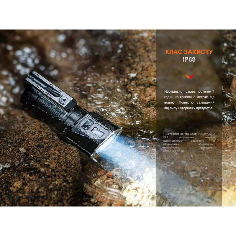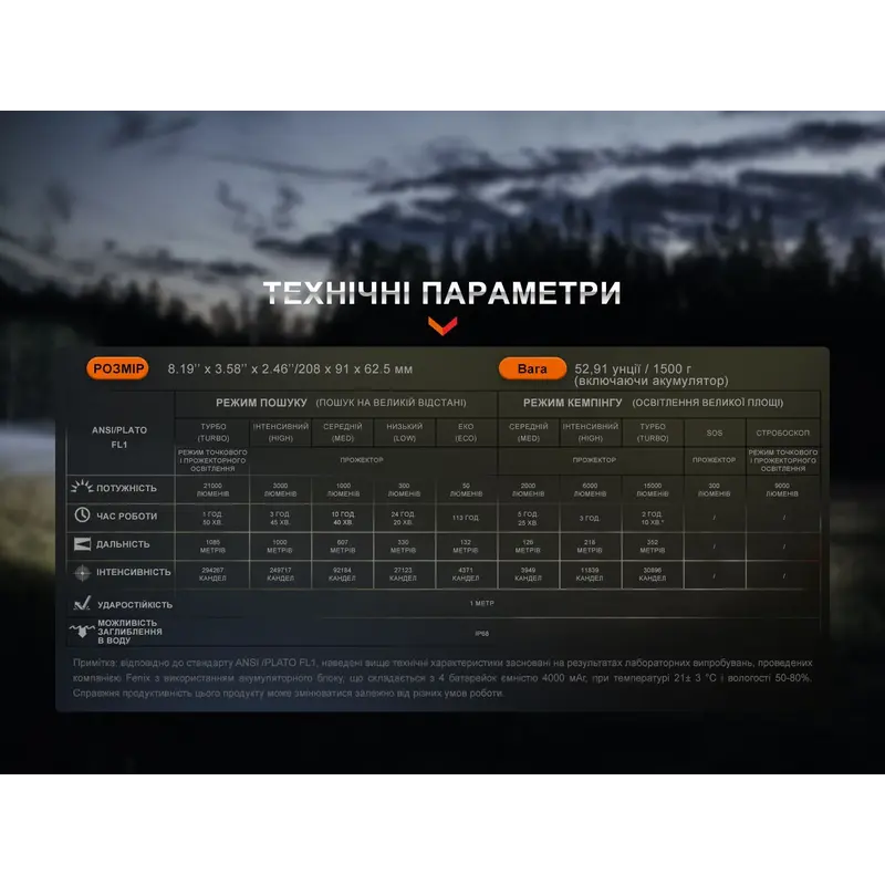 - Турбо: 15000 лм – 30896 кд – 352 метри – 2 год 10 хв;
