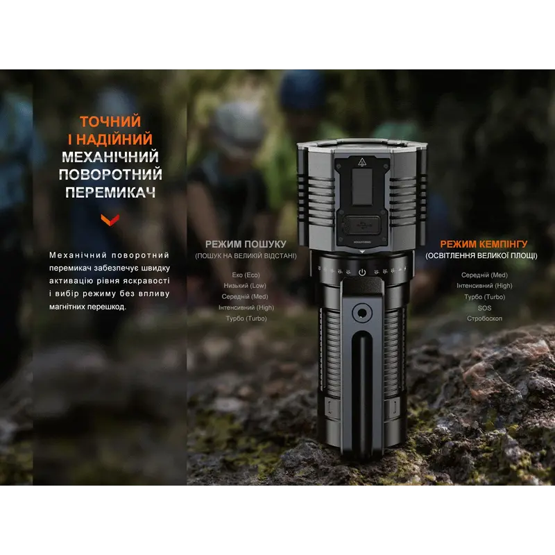 - Вибір групи режимів (пошукова / кемпінгова): для переходу в пошукові режими потрібно повертати перемикач за годинниковою стрілкою при вимкненому ліхтарі. Обертання перемикача проти годинникової стрілки активує один із кемпінгових режимів.
