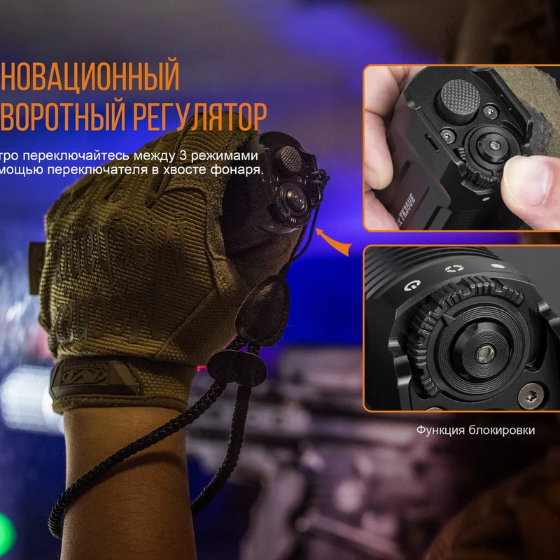 Використовувати дану модель ліхтаря зручно в будь-якій ситуації завдяки добре продуманій системі управління. Вона представлена функціональною і тактичної кнопками, а також тумблером для вибору настроюваної групи. Крім того, третє положення тумблера повністю блокує спрацьовування обох кнопок, що дуже зручно, коли необхідно перевозити TK35UE 2018 в одній сумці з іншими речами.