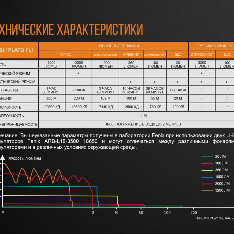 - Turbo: яскравість даного режиму, на відміну від попередньої групи, становить 3200 люмен, ліхтар світить на 300 метрів удалину і працює протягом 1,5 годин.
